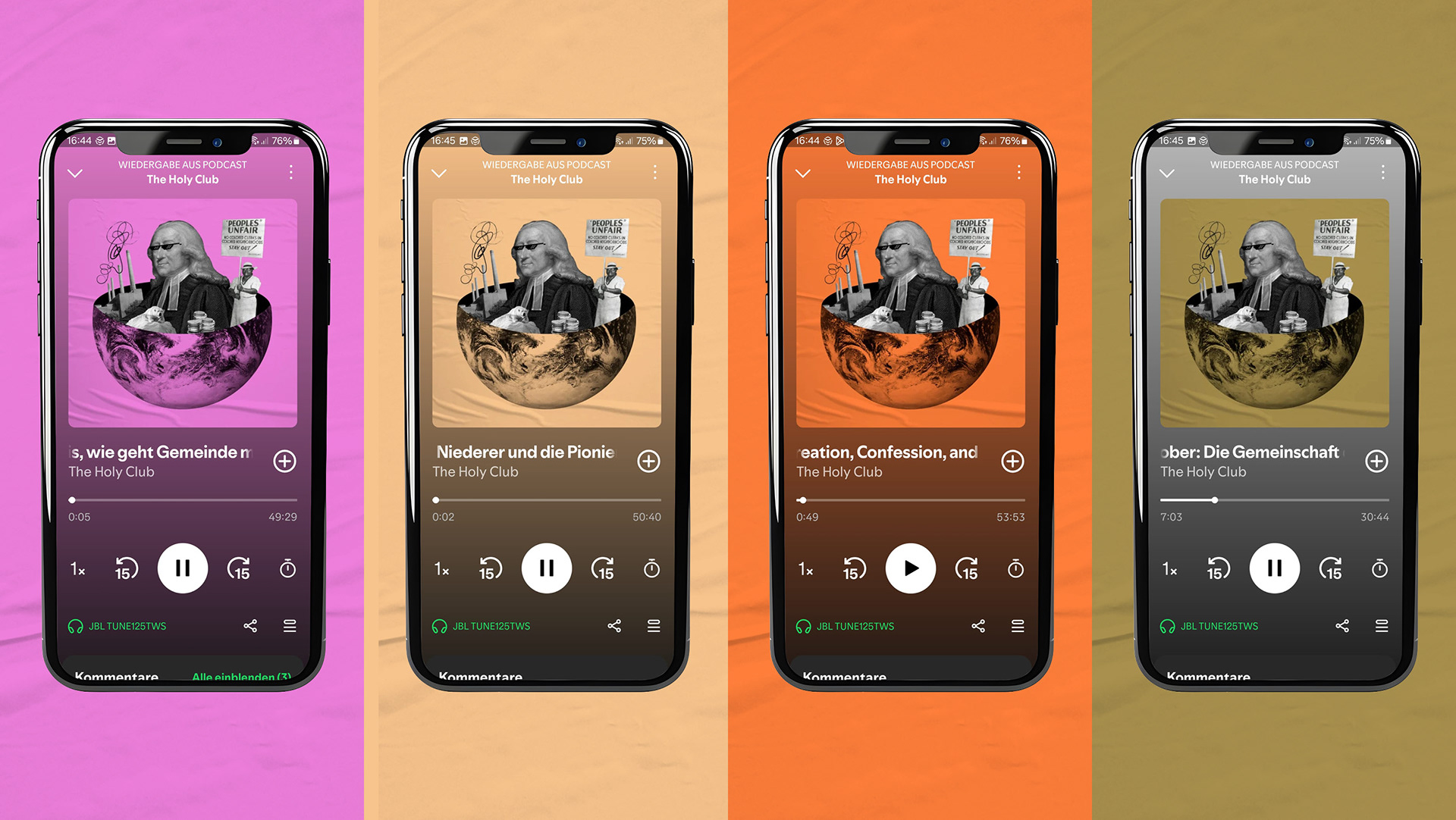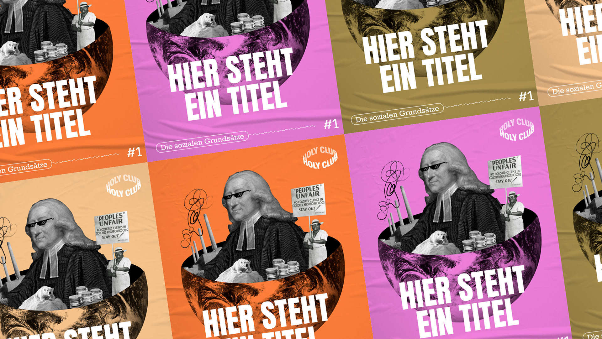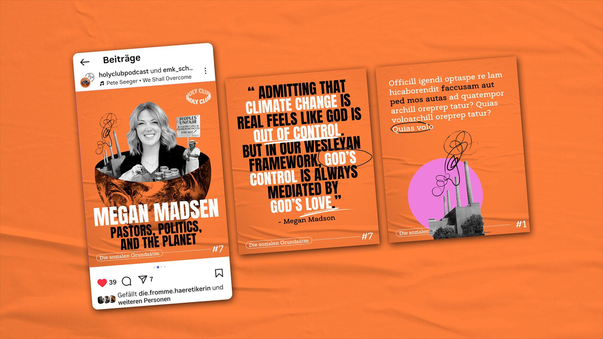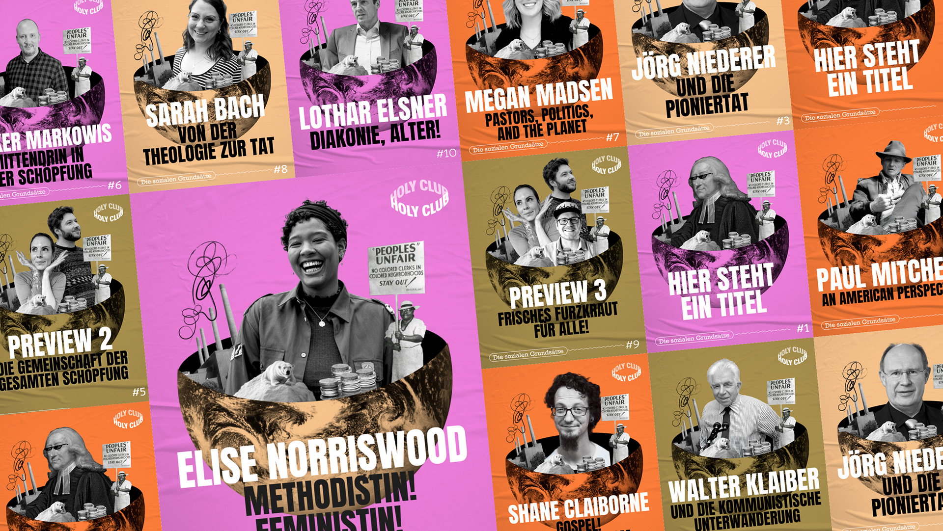 Für die neue Staffel des Podcasts The Holy Club entstand ein visuelles Konzept, das die Sozialen Grundsätze der Evangelisch-methodistischen Kirche – von Schöpfungsverantwortung über Wirtschaftsethik bis Gesellschaft – gestalterisch übersetzt. Kernstück ist ein Key Visual mit John Wesley in einer Weltkugel, die Gottes Schöpfung symbolisiert. In der Kugel verweisen illustrative Elemente wie ein Eisbär auf einer Scholle oder Geldmünzen auf die thematischen Schwerpunkte der einzelnen Folgen. Ergänzend wurden modulare Instagram-Templates für Start-, Inhalts- und Zitatseiten entwickelt, die eine klare, konsistente Social-Media-Präsenz der Staffel ermöglichen.